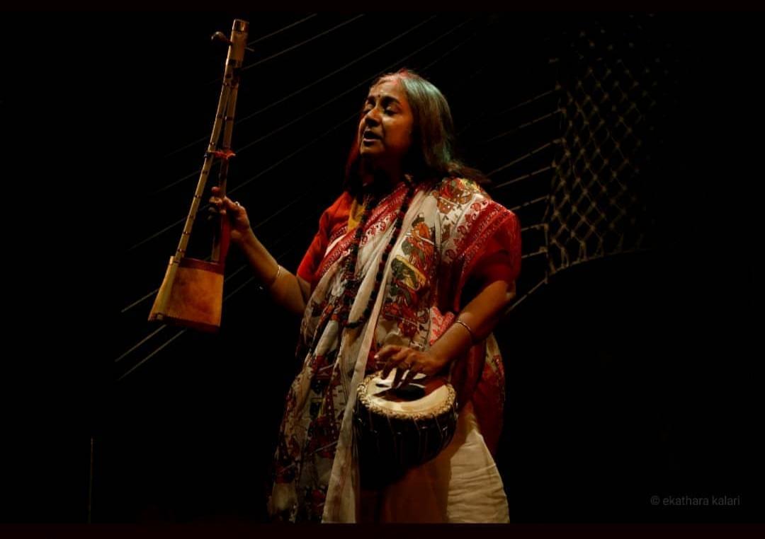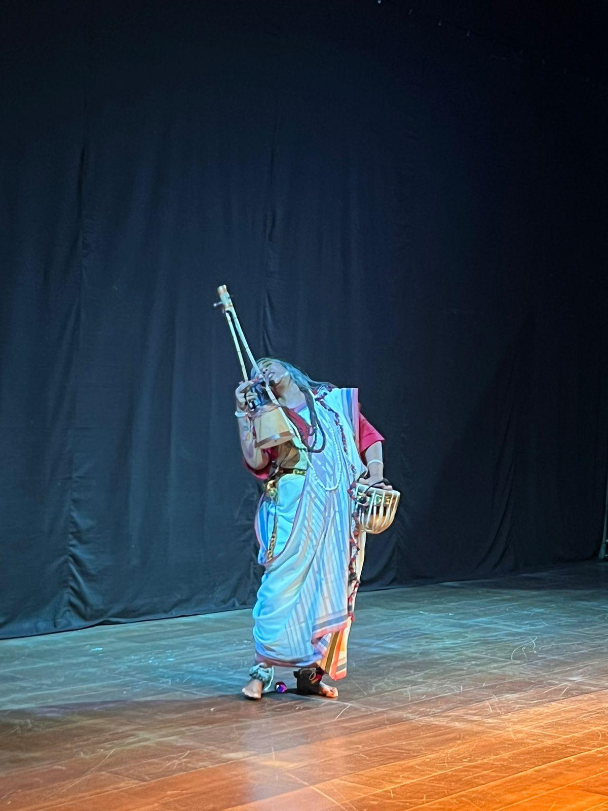 Dr. Uttara Chousalkar, in collaboration with Parvathy Baul, brings this ancient tradition into contemporary spaces, reciting Baul poetry with reverence and devotion. Uttara begins each performance by elaborating on the meaning of the Bengali song, ensuring the audience connects with the lyrical depth. Following this, she sings the song, her voice transcending to express a profound, spiritual experience. The performance unfolds with her accompanying dance, which is enhanced by the rhythmic beats of the Ektara, Duggi, and the jingling of Anklets.